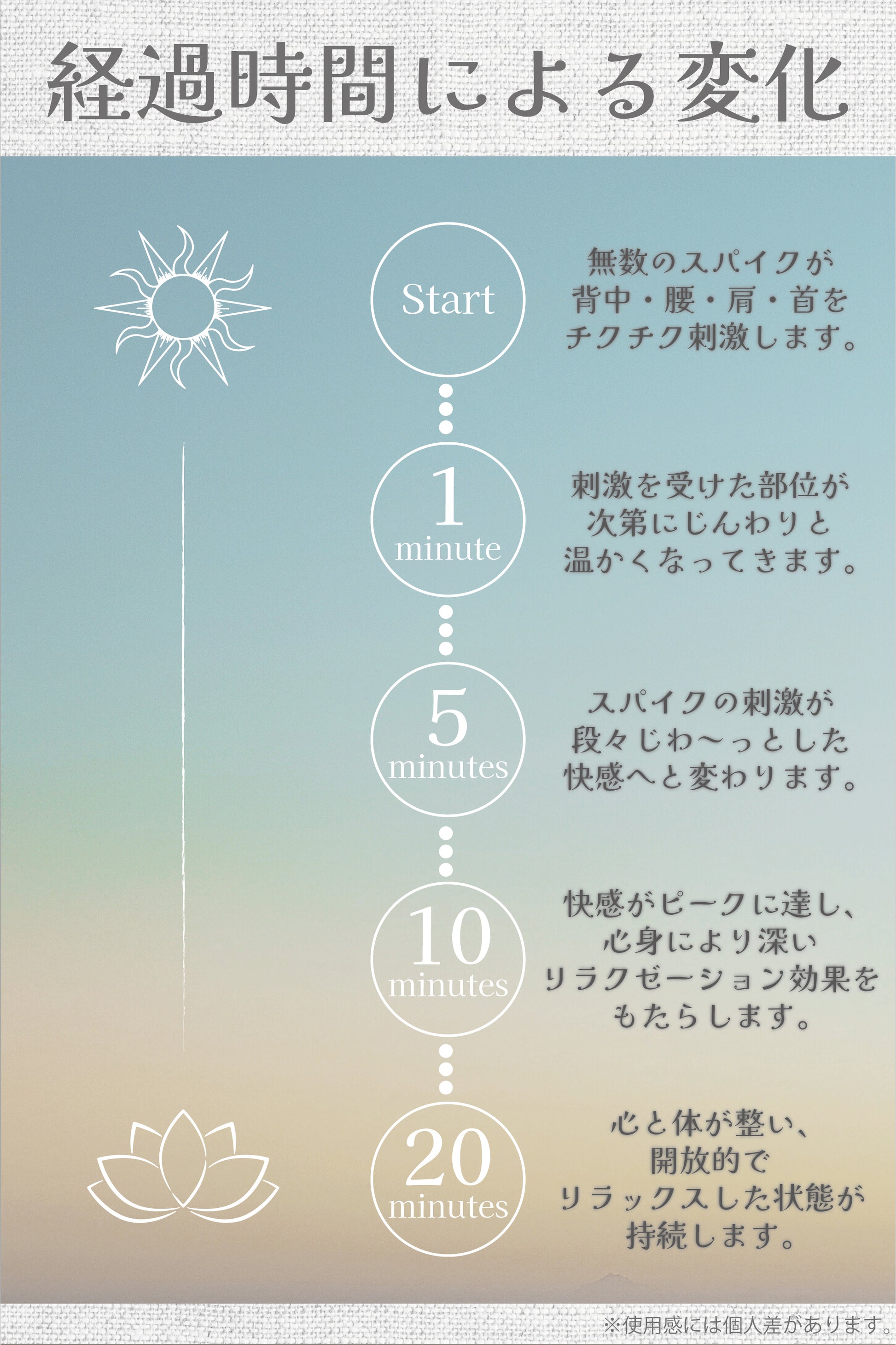 - ✅届いてスグに使用可能。マットの上で20分間寝るだけでじわ~っと背中が温かくなって、深いリラクゼーションを体感できます。