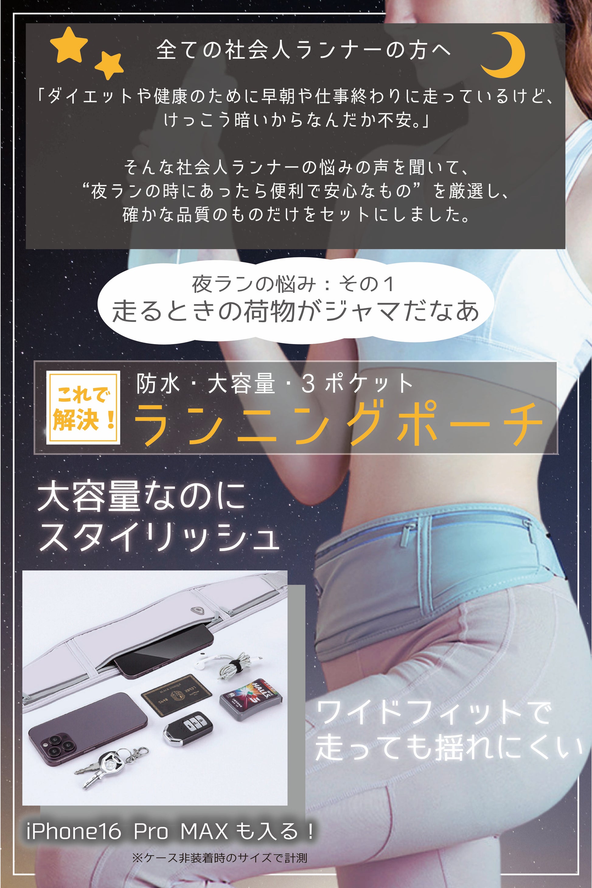【便利な3点セット】◆社会人ランナーの悩みから生まれた:「健康やダイエットのためにランニングをしたいけれど、仕事が忙しくて外が暗くなった時間しか走れない。」「暗い時間に走るのはなんか不安」「変な人に会ったらどうしよう」そんな社会人ランナーのお悩みを解決できる便利なアイテムをセットにしました!